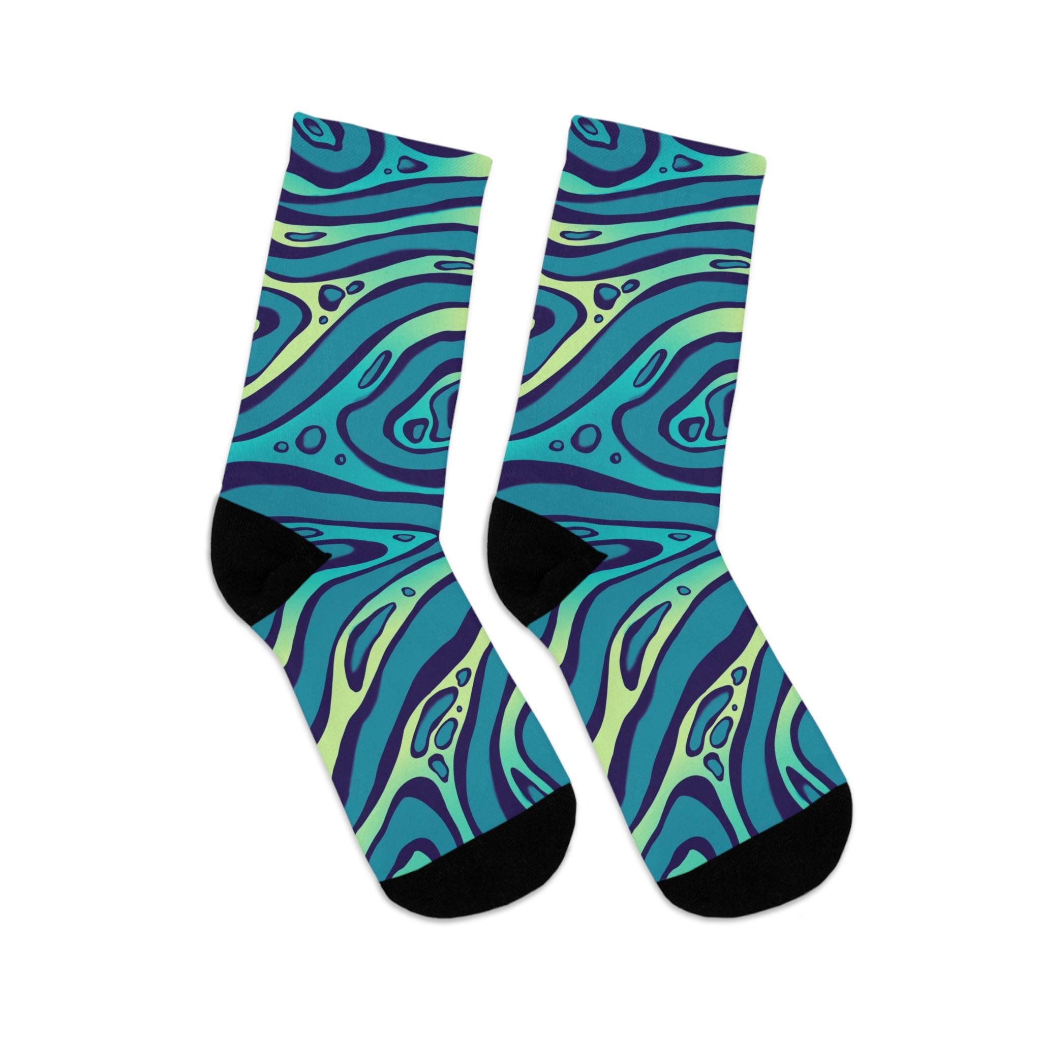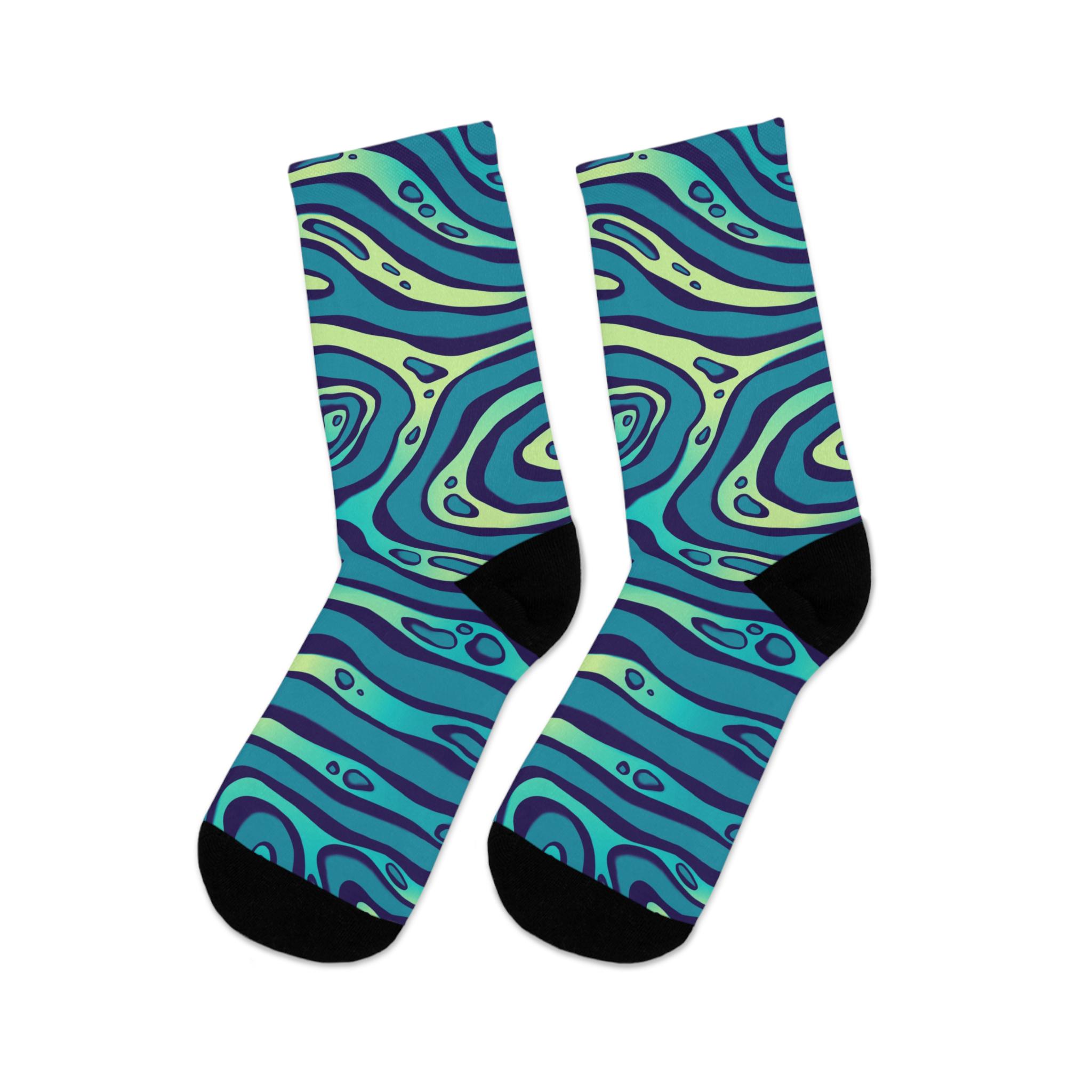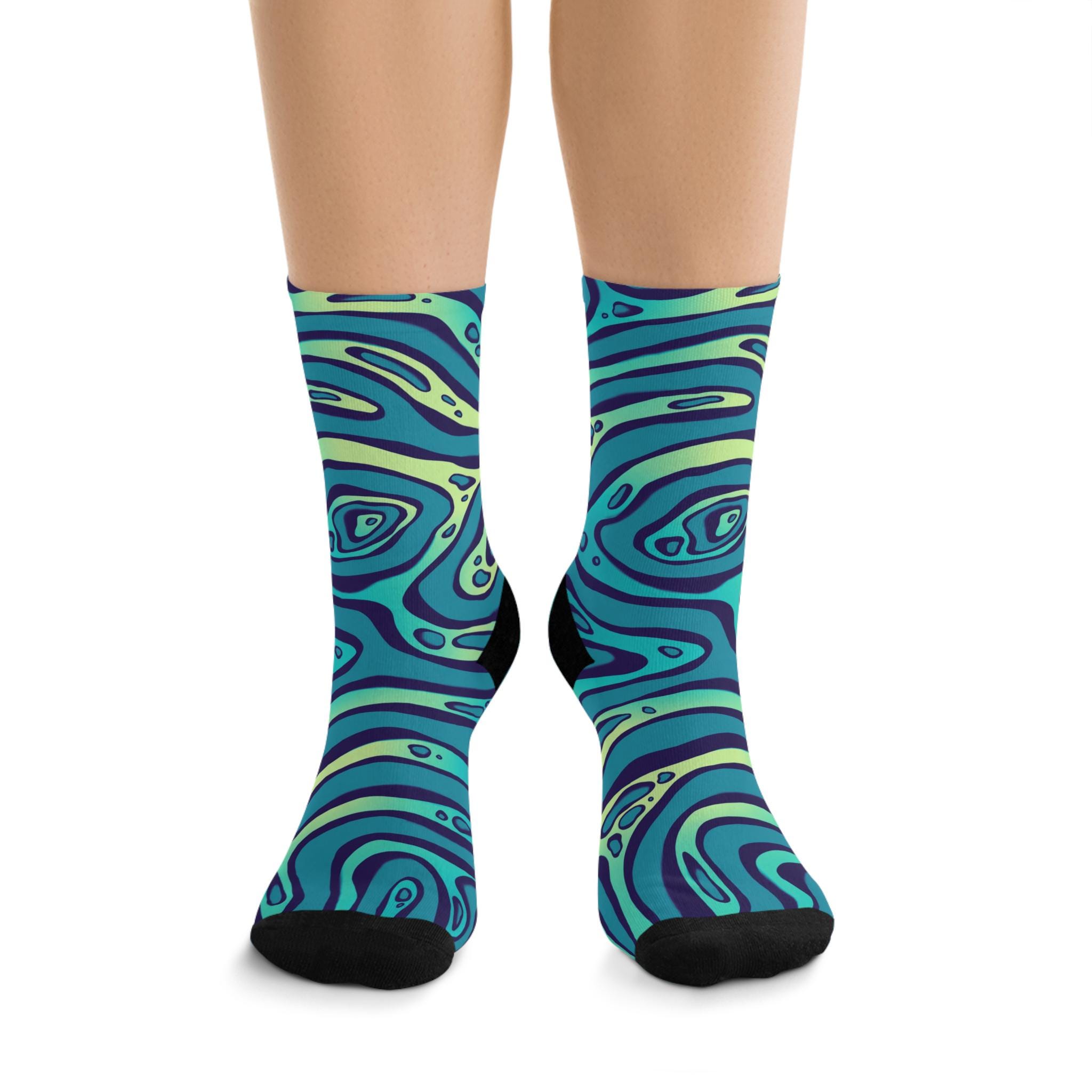 Slide into a pair of socks that feel like a mini ocean for your feet. These recycled-poly socks wrap your ankles in smooth, 200-needle knit comfort while a swirling teal-and-indigo pattern adds playful movement to your everyday. They bring color to slow mornings, studio sessions, and long walks around the neighborhood. Lightweight but durable, they breathe and stretch with a touch of elastane while the reinforced heel and toe keep them steady through repeat wear. Expect a little color washout on the first laundry run — it’s part of the vibrant, fabric-forward character they bring to your wardrobe.