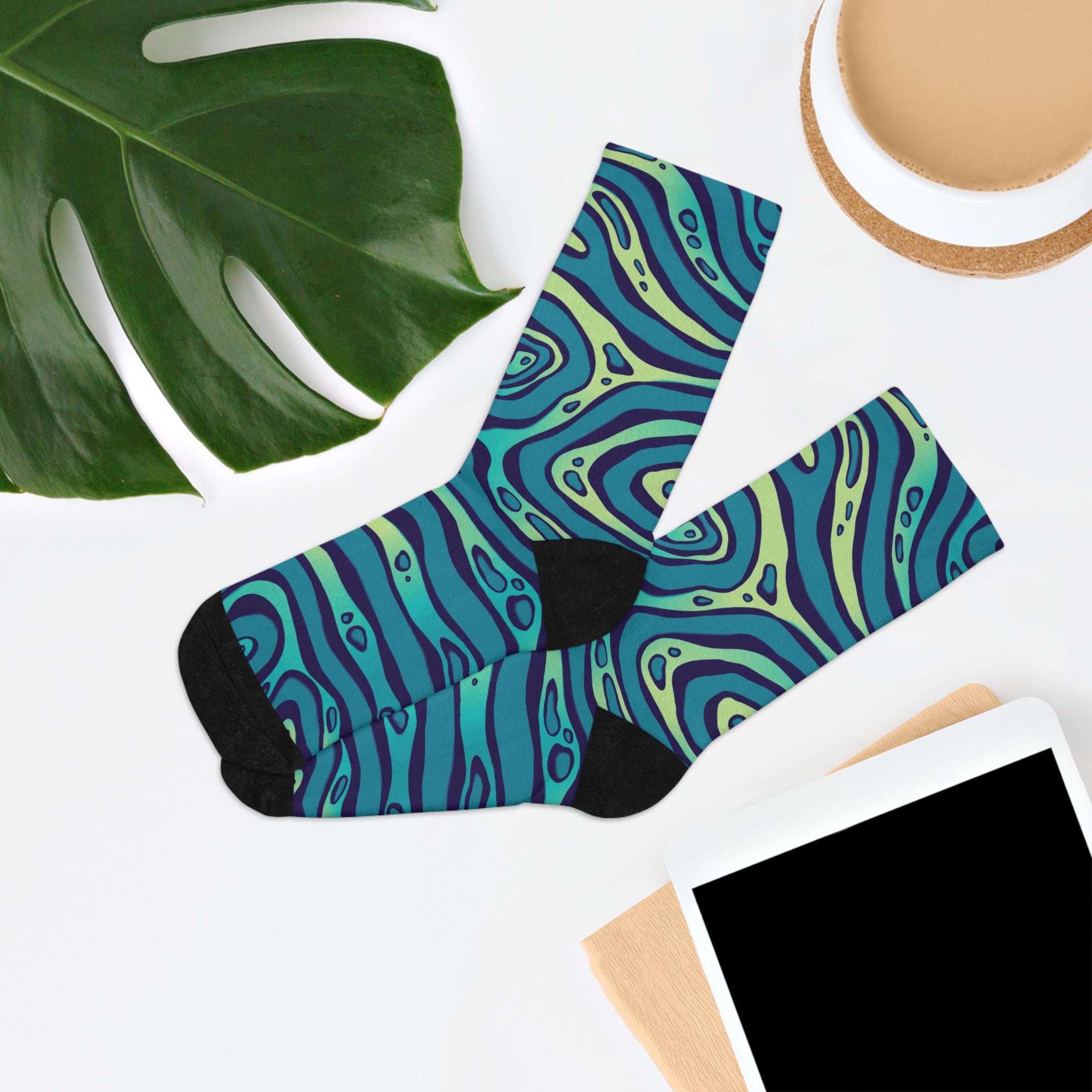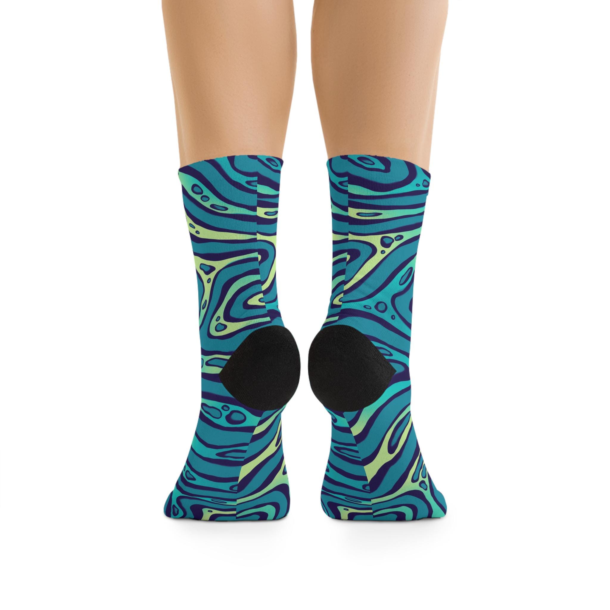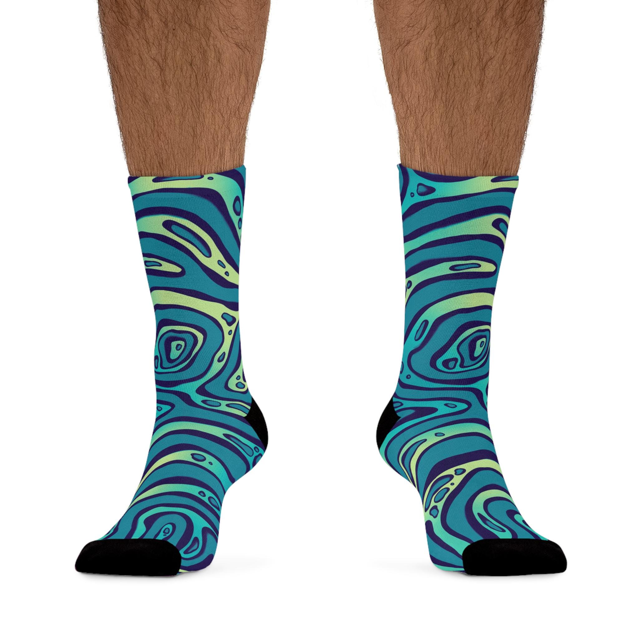 Slide into a pair of socks that feel like a mini ocean for your feet. These recycled-poly socks wrap your ankles in smooth, 200-needle knit comfort while a swirling teal-and-indigo pattern adds playful movement to your everyday. They bring color to slow mornings, studio sessions, and long walks around the neighborhood. Lightweight but durable, they breathe and stretch with a touch of elastane while the reinforced heel and toe keep them steady through repeat wear. Expect a little color washout on the first laundry run — it’s part of the vibrant, fabric-forward character they bring to your wardrobe.