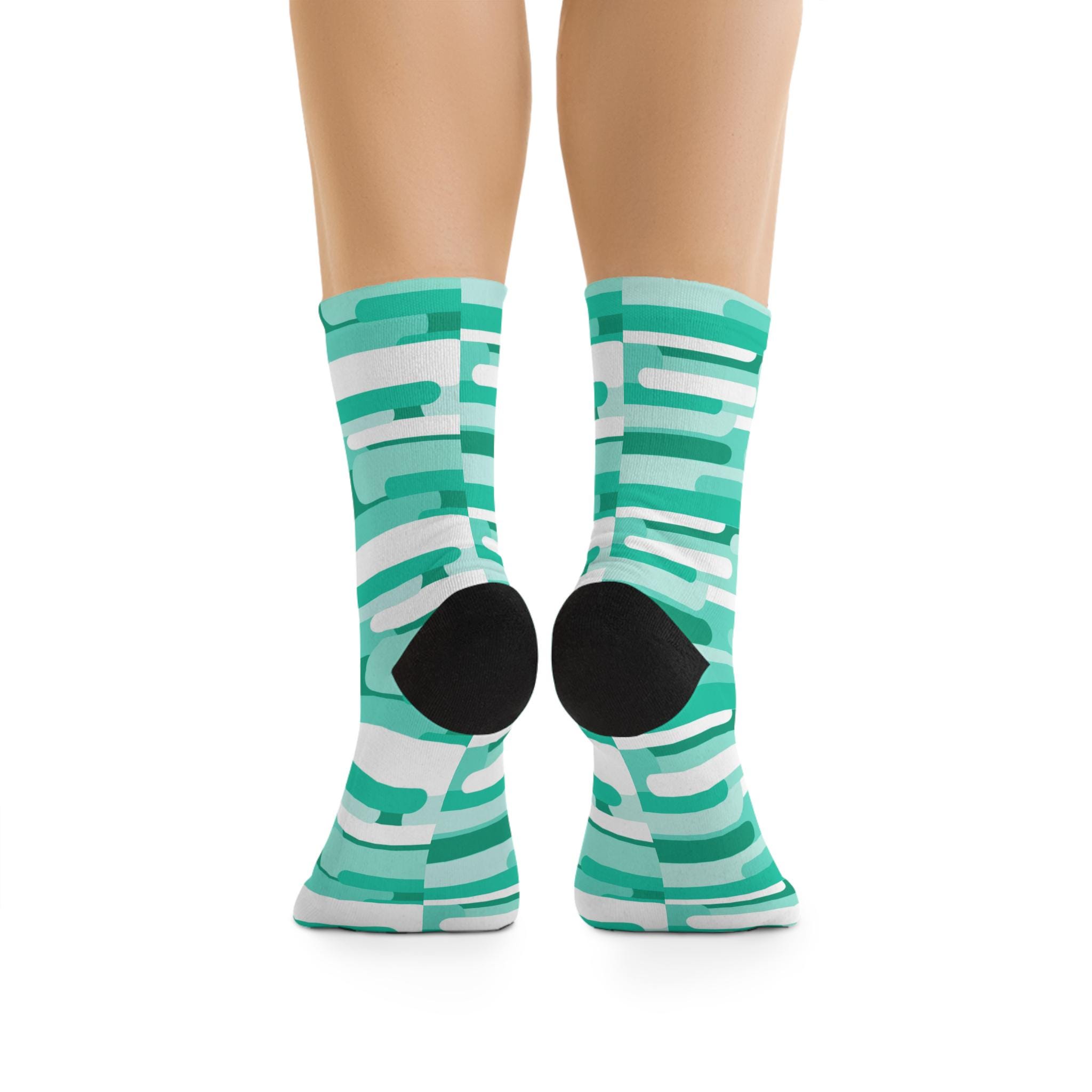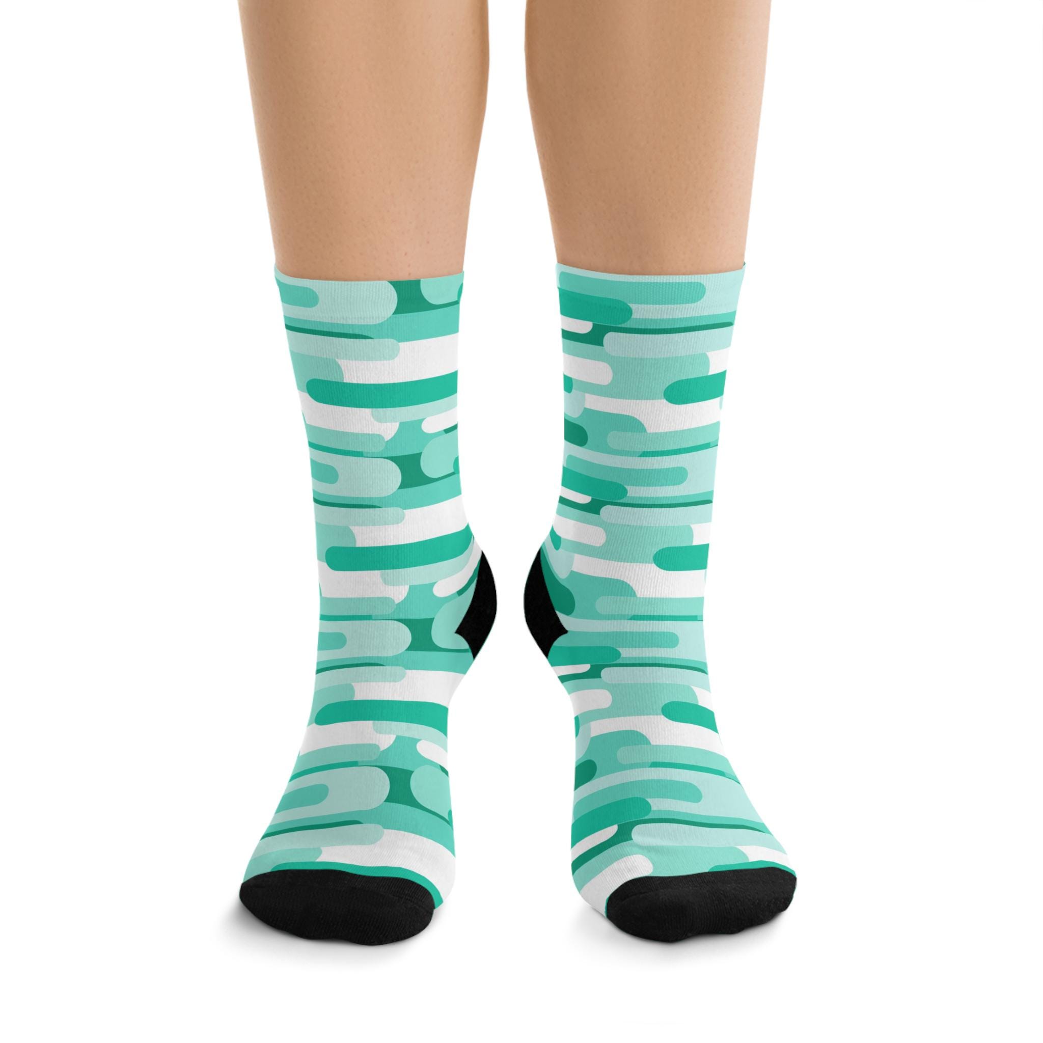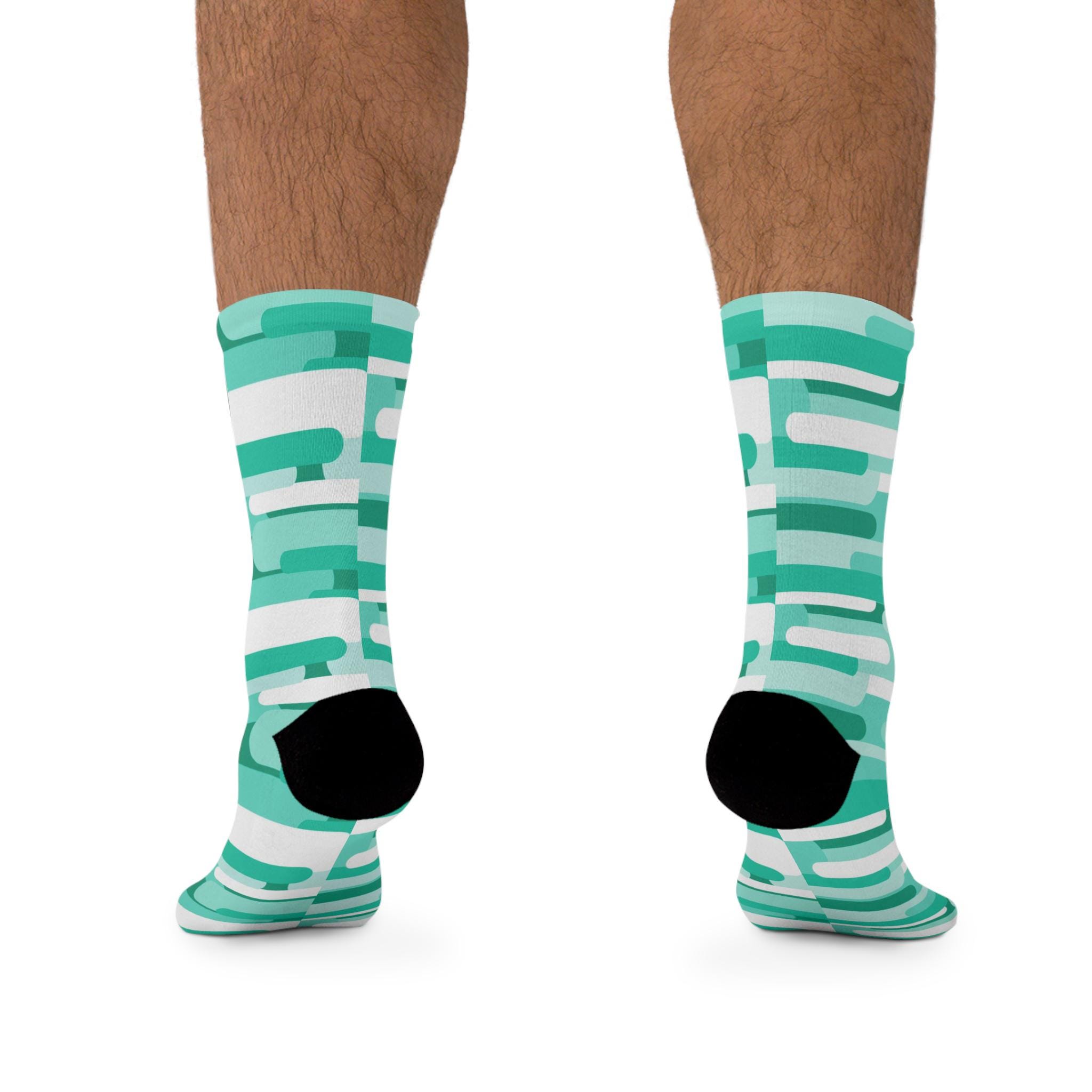These recycled-poly socks bring bright, graphic energy to everyday wear while keeping sustainability front and center. The mint-and-teal geometric print wraps fully around each sock, so the pattern reads the same from every angle. The knit is dense and smooth (200-needle), giving a soft but structured feel that holds color and shape. Because the yarn is mostly recycled polyester blended with nylon, cotton and a touch of elastane, the socks stretch comfortably and return to fit without sagging. Wear them with rolled jeans, sneakers, or your favorite at-home loungewear to add a pop of color and a small eco-conscious choice to your rotation. Expect a bit of color release on the first wash—wash separately once to keep the tones crisp.