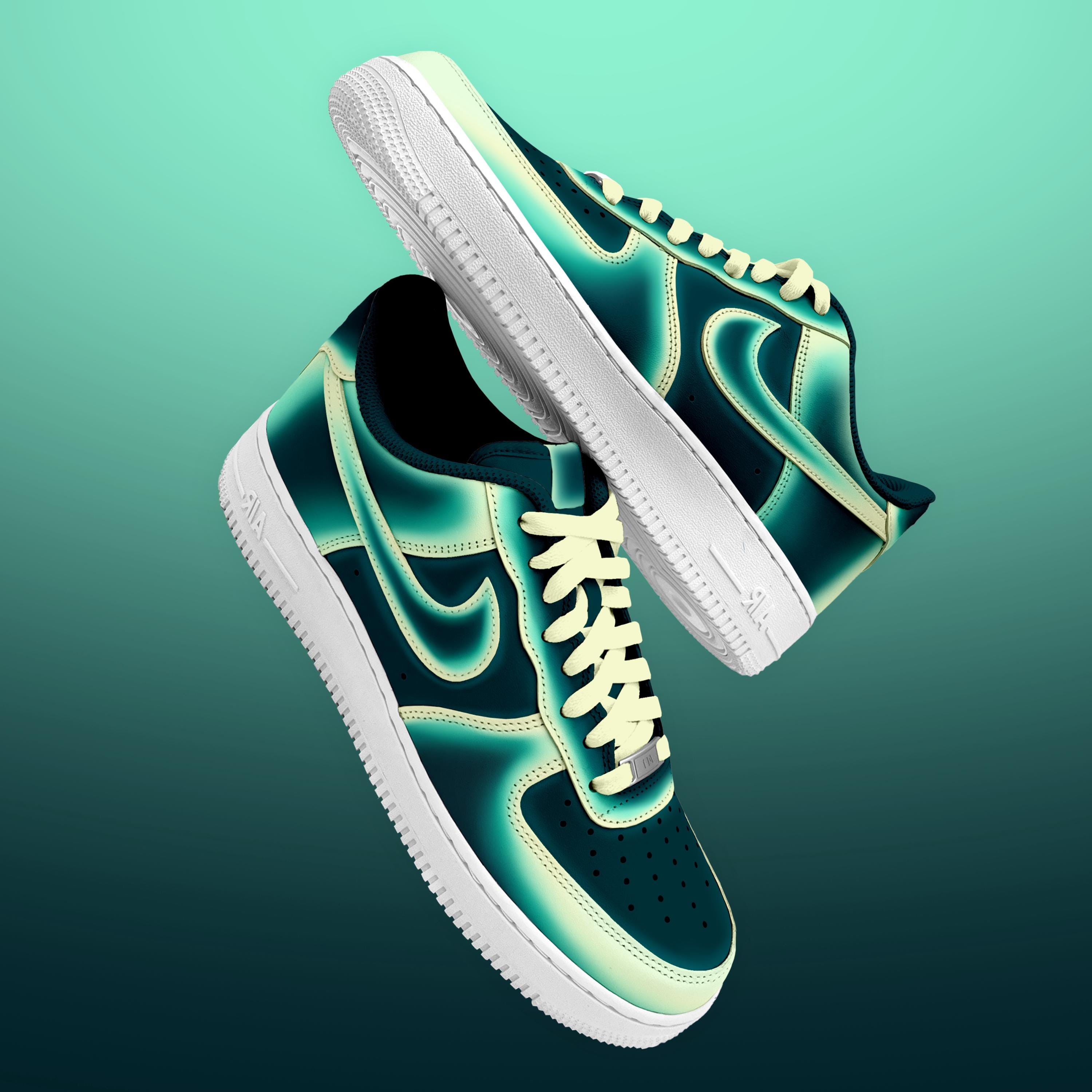 This pair of custom Air Force 1s was designed with green glow paint in mind! The mock-up depicts what the shoes will look like in daylight, and the lighter green colors will glow in the dark. Subtle fades keep the design sophisticated. This combination of dark teals and brighter greens would look perfect with a matching graphic tee. The glowing element allows you to dress them up for a night out!